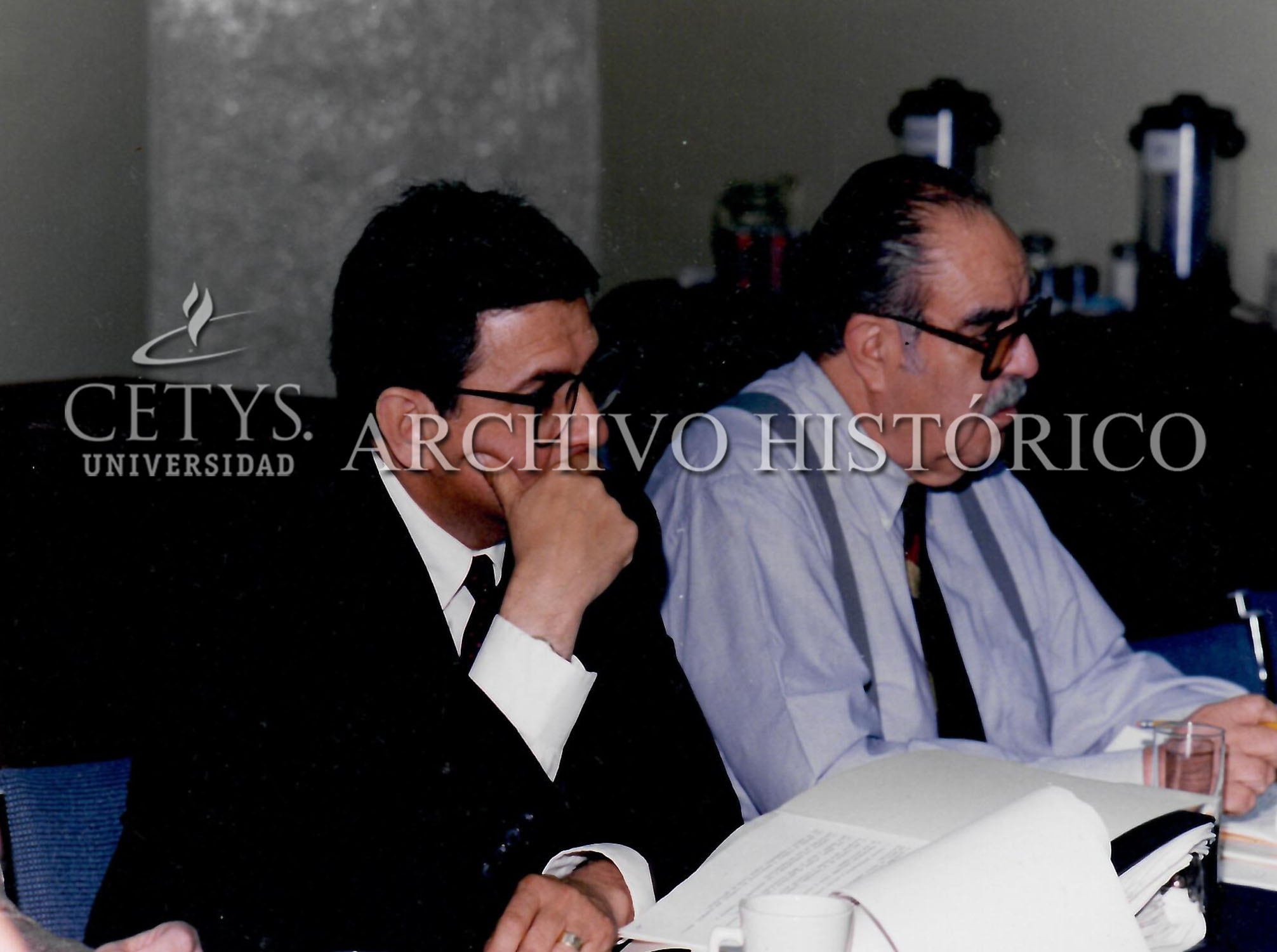 Resumen : La fotografía muestra Junta del Consejo del Instituto Educativo del Noroeste A.C. (IENAC), de iqz. a der. primera persona 1) Rector Enrique Carrillo Barrios Gómez [1996-2000], 2) Lic. Héctor Sada Quiroga.