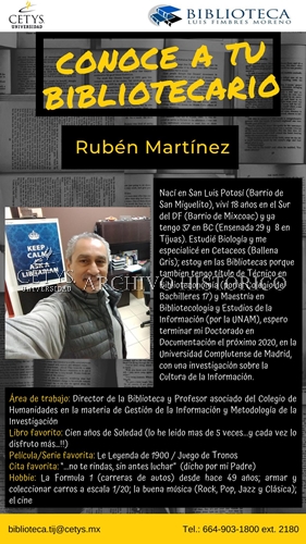 | Resumen : | El rector designó al Mtro. Rubén Federico Martínez Rocha en 2011 como director del Centro de Información, quien inicia formalmente funciones a partir del 1ro. Agosto del presente, con un período de familiarización anticipada en este mes de junio.Martínez Rocha cuenta con una Maestría en Bibliotecología y Estudios de la Información por la Universidad Nacional Autónoma de México |