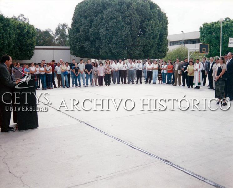 Personajes: TIJ-DG 0345: Lic. Miguel Angel Salas Marrón, Director General. TIJ-DG 0347: Lic. Miguel Angel Salas Marrón, Director General (Pódium). A la izquierda: Personas no identificadas. Frente al árbol: Dra. Patricia Valdes Flores (Blusa rosa – pantalón café), Lic. Martha Beltrán, Coordinadora de Recursos Humanos, (blusa de colores-pantalón negro), Ing. Daniel Moctezuma Canchola, Director de Informática, Lic. Jesús Cabrera Tapia, Director de humanidades, Mtro. Enrique Pérez Santana, Director de la ECA, Mtro. Gustavo Gil González Fernández, Personas no identificadas, C.P. Rodrigo Valle Hernández, Presidente del IETAC Capítulo Tijuana (traje café y lentes para el sol), Dr. Enrique Carrillo Barrios Gómez, Rector (traje negro), C.P. Alfonso Martínez Romo Consejero del IETAC Capítulo Tijuana y concesionario de la cafetería y propietario de La Torta Plaza (Traje negro), Sra. María Eugenia López de Martínez (saco y pantalón blanco).